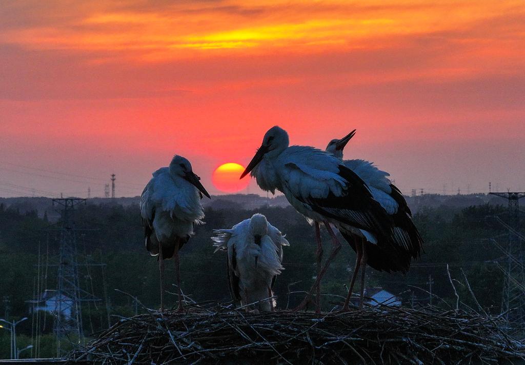 2024年5月16日,东方白鹳栖息在高邮一处铁塔上。