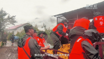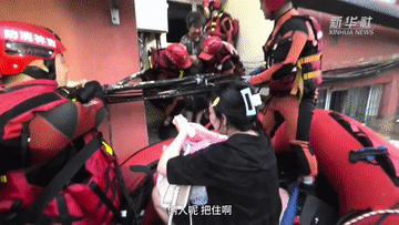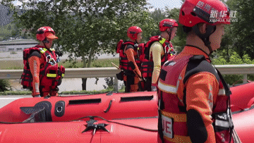 在G331公路一处积水路段,他们穿着厚重的急流救生衣,拖着冲锋舟向积水区域前进,只为探明水情。在建国街道解放社区,他们又划起了冲锋舟,为转移到高层楼的群众送去食物和饮用水。