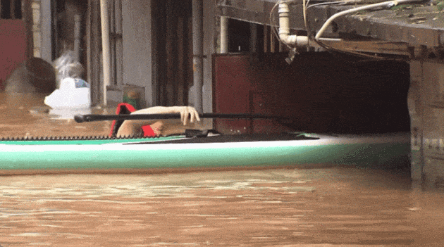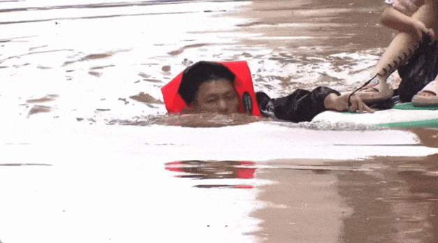 “当时我一跳下去,本来准备踩到底拖着过去。但我踮着脚还踩不到底,所以只能游泳,采取托着桨板游泳的方式。”在浑水中,余祖恩不断换气,多次钻进水淹的楼道,在漂浮着各种杂物的水中艰难前行,将一个又一个被困群众安全转移。他说,“水淹到脖子,我也要把人救出来!”