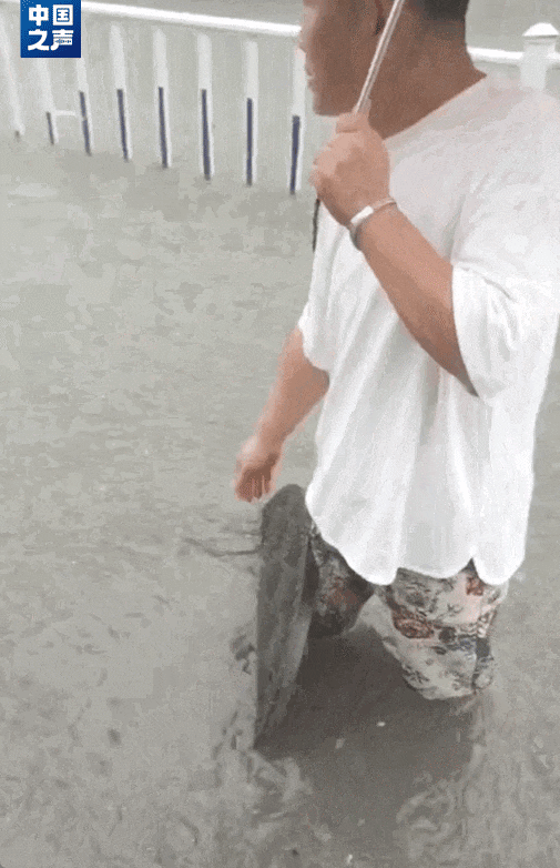 视频画面中,一位身穿白色短袖的男子站在没膝大水里,用腿顶着被雨水冲开的窨井盖,左手撑着伞,右手不断挥手示意,提醒过往行人和车辆注意安全。