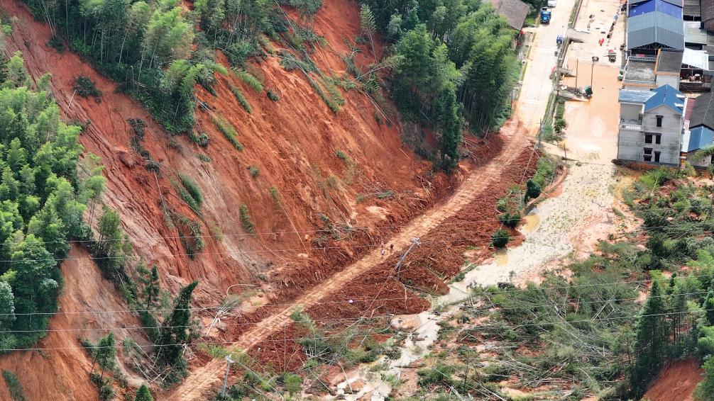 资兴市八面山瑶族乡一处被山体滑坡掩埋的道路已被疏通(7月30日摄,无人机照片)。新华社记者 陈振海 摄