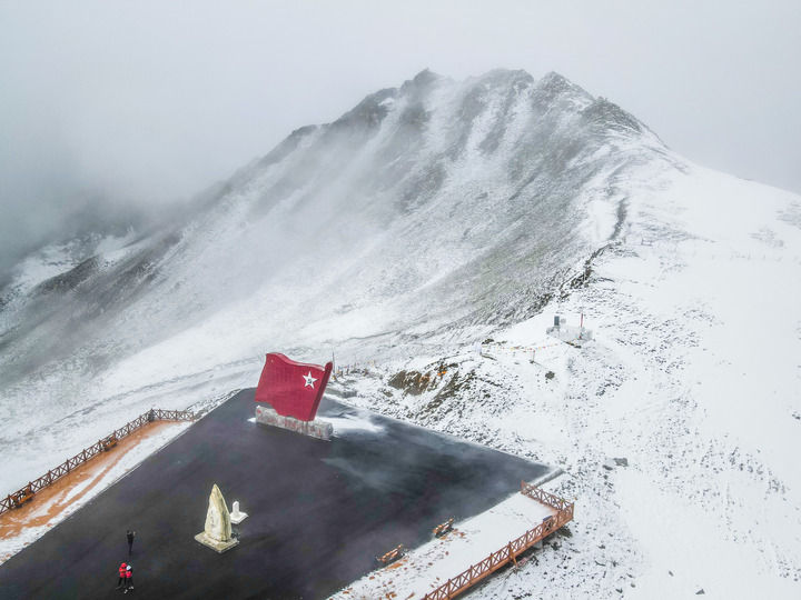这是位于四川夹金山海拔4114米垭口的红色主题文化景观(2021年5月12日摄,无人机照片)。新华社发(郝立艺 摄)