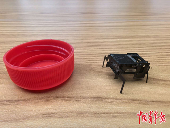 这只“甲虫”机器人比矿泉水瓶盖还小。中青报·中青网记者 张渺/摄