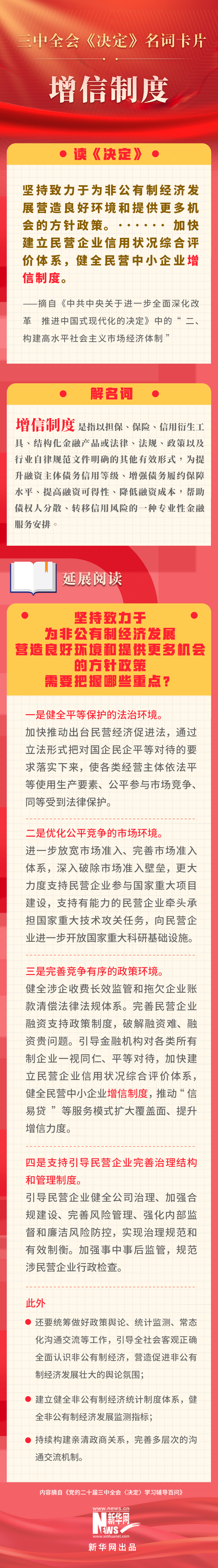党的二十届三中全会审议通过了《中共中央关于进一步全面深化改革、推进中国式现代化的决定》。新华网依据《党的二十届三中全会〈决定〉学习辅导百问》,制作三中全会《决定》系列名词卡片,和大家一起来深入学习领会二十届三中全会精神。本期名词是“增信制度”。
