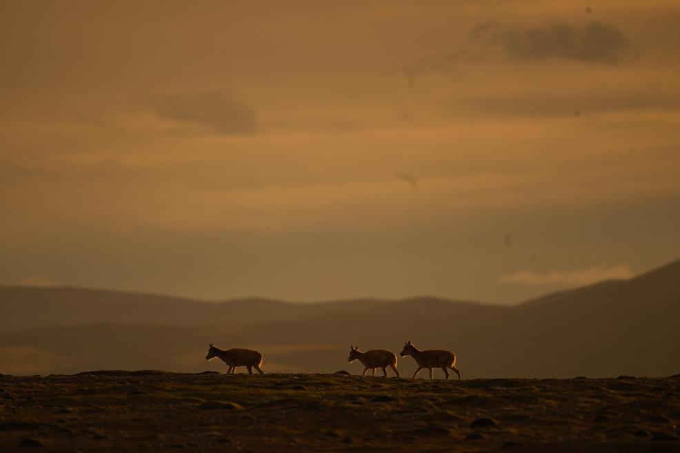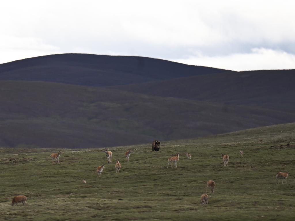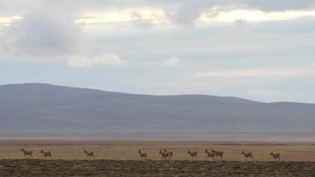 巡山车辆行驶在卓乃湖周边,越来越多的藏羚羊出现在山梁上,跃动的身影瞬间赶走了无人区的孤寂。为了不干扰动物,我们尽量放慢车速,默默欣赏眼前的一切。