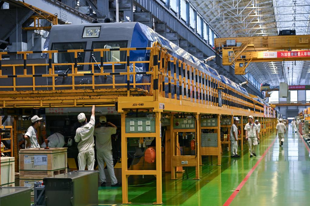 7月26日,中车株洲电力机车有限公司工作人员在总成车间组装大功率电力机车。新华社记者 李鑫 摄