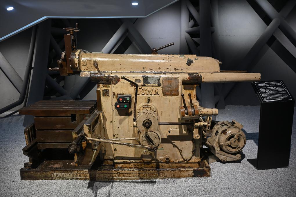 中车株洲电力机车有限公司展厅内摆放的一台1936年从英国购买的机床,铸有“中英庚款”字样,它是中车株机公司从修理进口的“万国牌”蒸汽机车到研制出口高端轨道交通装备的见证(7月26日摄)。新华社记者 李鑫 摄