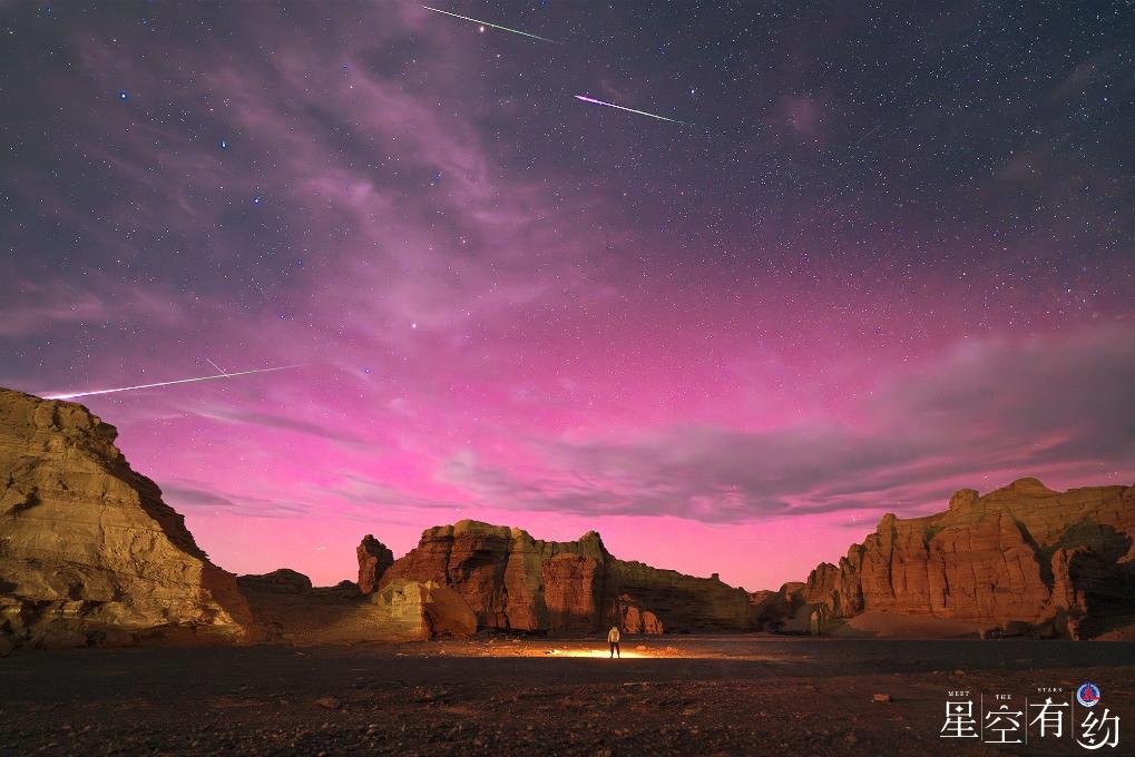 星空摄影师王文燕8月13日凌晨在新疆哈密大海道拍摄的英仙座流星雨与美丽极光。(星联CSVA供图)