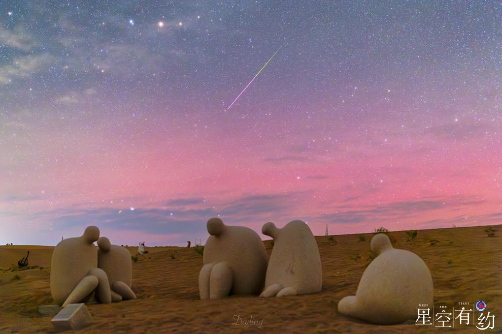 星空摄影师代玲8月13日凌晨在甘肃民勤拍摄的英仙座流星雨与美丽极光。(星联CSVA供图)