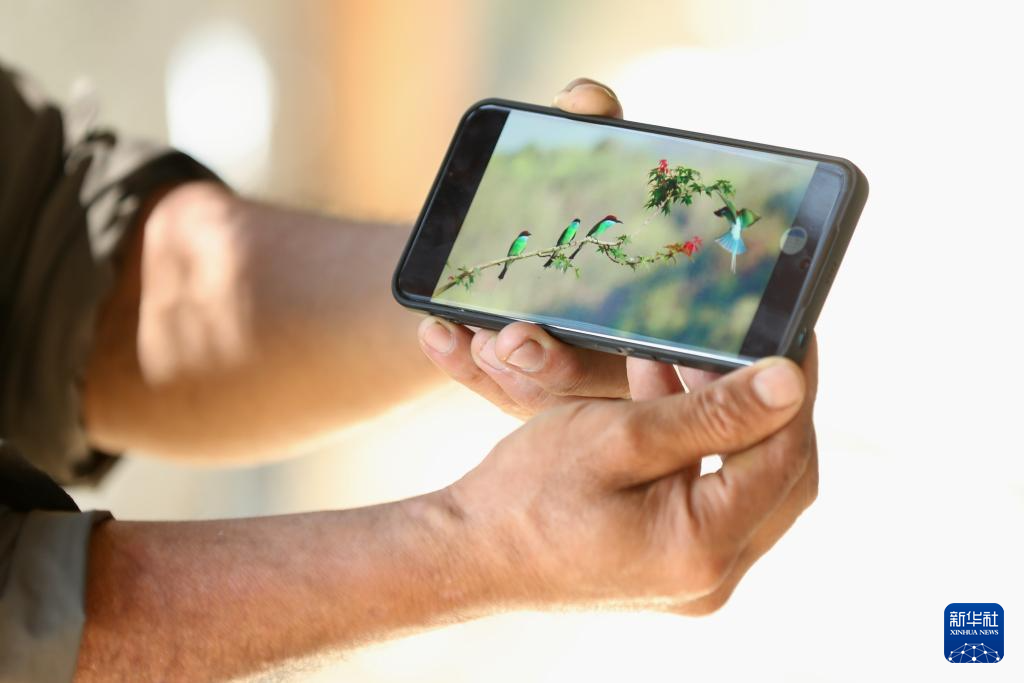 8月12日,福建南平市延平区炉下镇斜溪村村民王崇年展示手机里摄影爱好者发来的蓝喉蜂虎照片。 新华社记者 姜克红 摄
