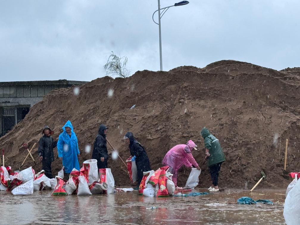 当地党员干部、群众在乌牛堡子村村委会门口装沙袋。(受访者供图)