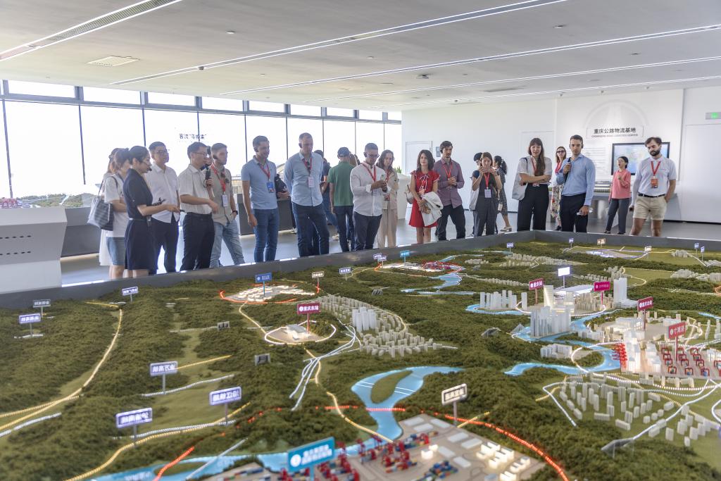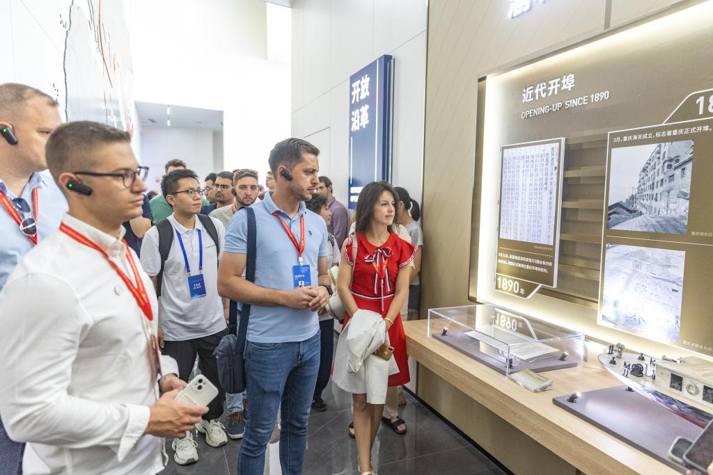 8月15日,2024“未来之桥”中国—中东欧青年研修交流营成员在重庆内陆国际物流枢纽展示中心参观。新华社记者 黄伟 摄