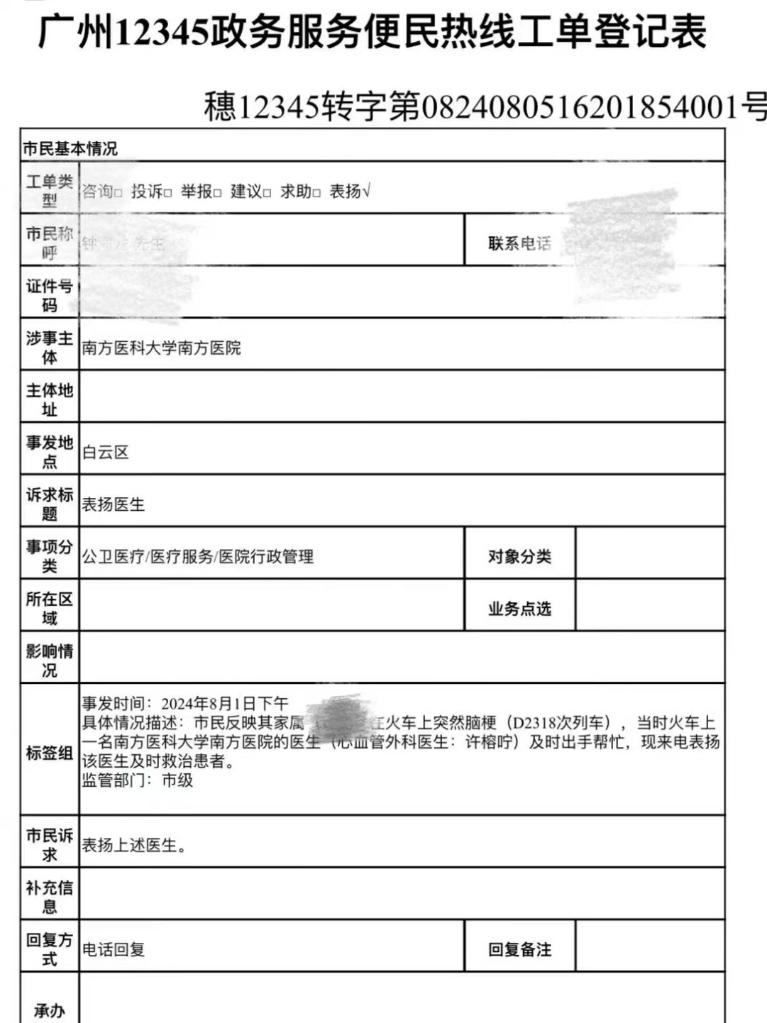 突发脑梗乘客家属事后向广州12345热线表扬徐榕咛医生。新华社发