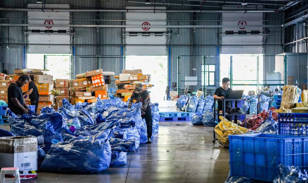 8月13日,工作人员在珲春综合保税区跨境电商物流仓库内打包货物。新华社记者 颜麟蕴 摄