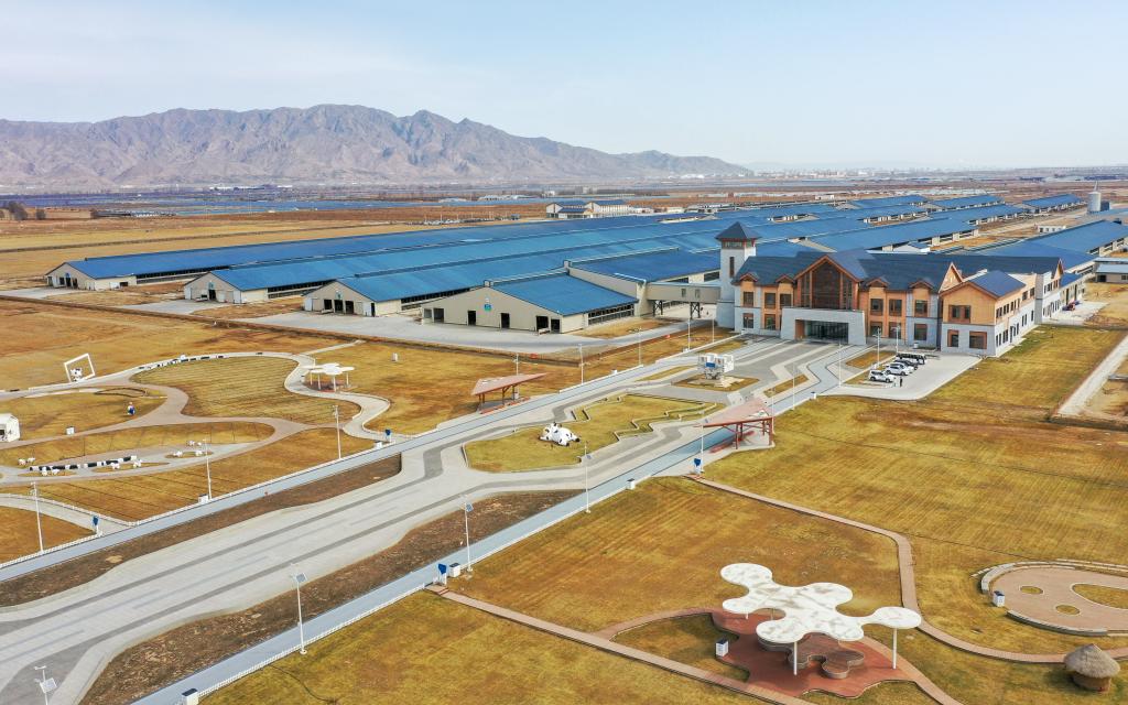位于呼和浩特市土默特左旗的伊利敕勒川生态智慧牧场。(无人机照片)新华社记者连振 摄