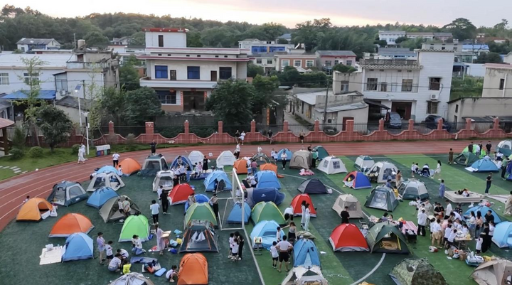 学生和家长在长沙市天心区青园柒祥小学操场搭帐篷。(王小欢 摄)