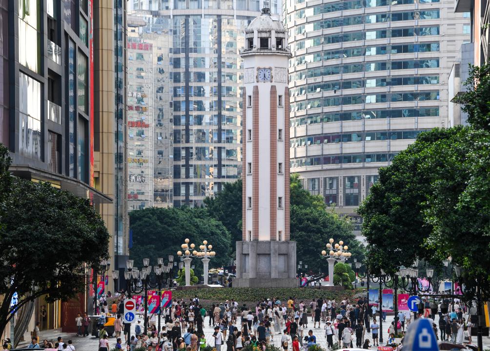 8月21日,游客在重庆市渝中区解放碑商圈休闲。新华社记者 王全超 摄