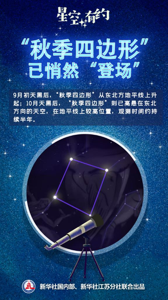 由飞马座中的三颗亮星和仙女座的亮星α一起构成的“秋季四边形”,在9月天黑后已在天幕上悄然“登场”。王科超介绍,9月初天黑后,“秋季四边形”从东北方地平线上升起;10月天黑后,“秋季四边形”则高悬在东北方向的天空,在地平线上较高位置,观测时间约持续半年。
