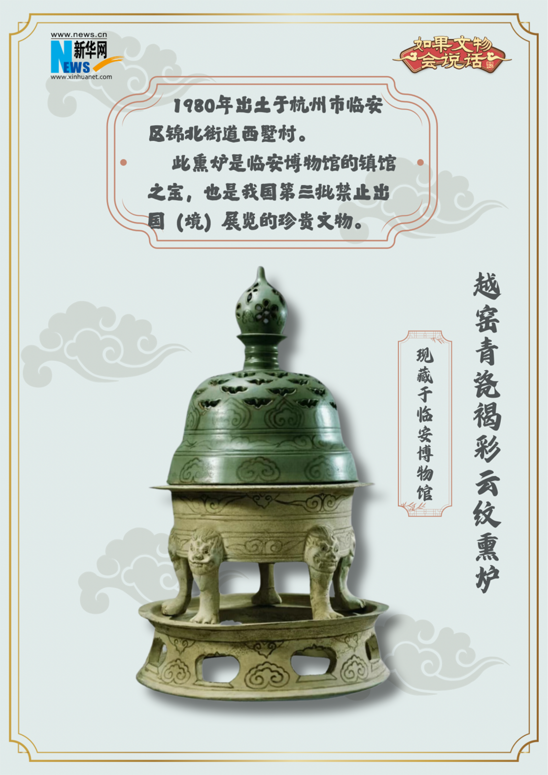 越窑青瓷褐彩云纹熏炉,1980年出土于杭州市临安区锦北街道西墅村。此熏炉是临安博物馆的镇馆之宝,也是我国第三批禁止出国(境)展览的珍贵文物之一。