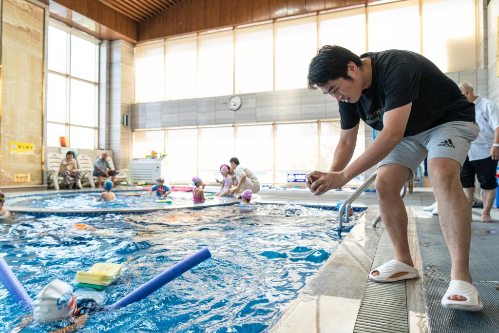 7月25日,在安徽省合肥市包河区的一家游泳馆内,朱建国正在为顾客拍摄短视频。新华社记者赵金正 摄