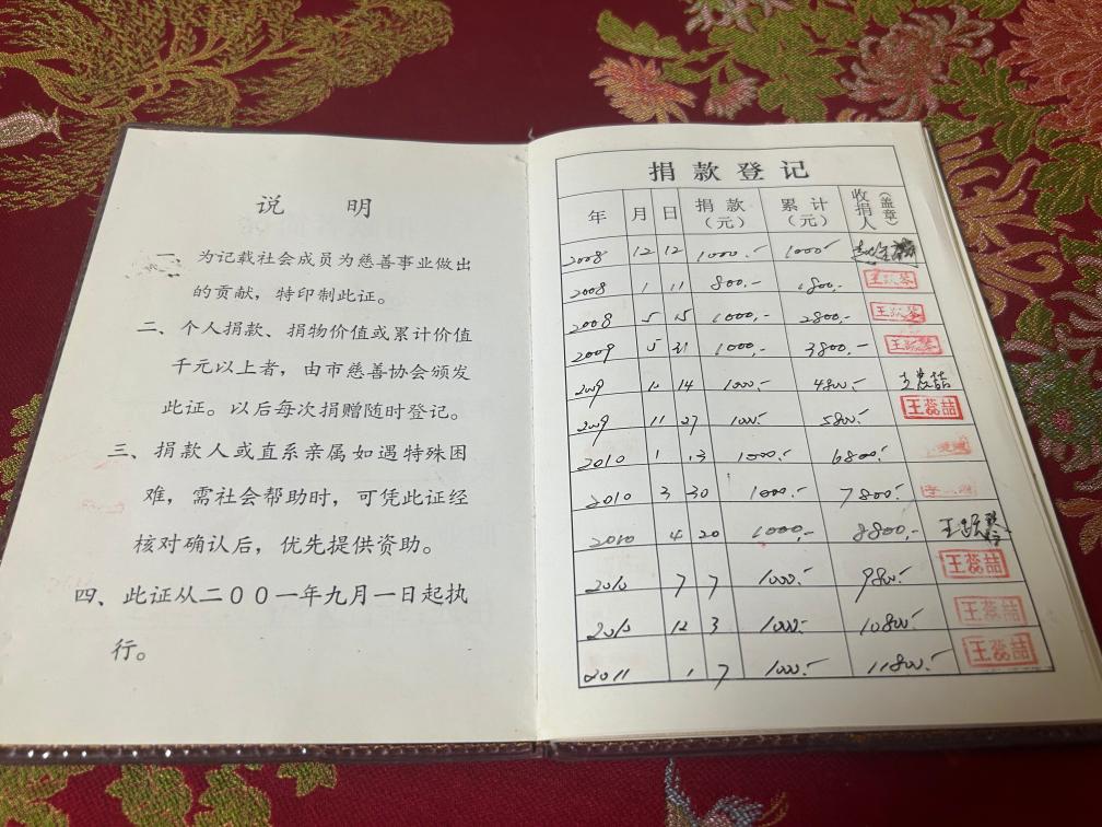 在王燕玺的捐款证书上密密麻麻写着捐款记录,最新一页的数据显示,她已累计向天津市慈善协会捐款超12万元。
