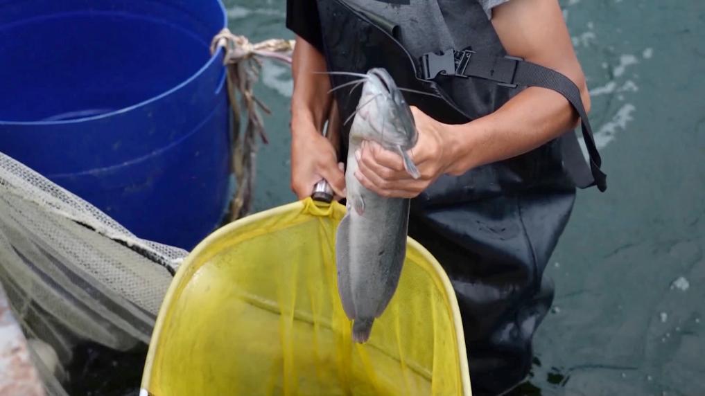 农场职工正在捞鱼。