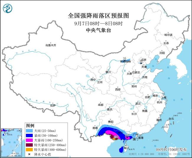 预计,9月7日08时至8日08时,广西中南部、广东西南部、海南岛西部、云南东南部以及内蒙古中部、河北中部等地部分地区有大到暴雨,其中,广西南部、广东西南部、云南东南部等地部分地区有大暴雨,广西南部沿海局地特大暴雨(250~450毫米)。上述部分地区伴有短时强降水(最大小时降雨量50~80毫米,局地可超过100毫米),局地有雷暴大风等强对流天气。