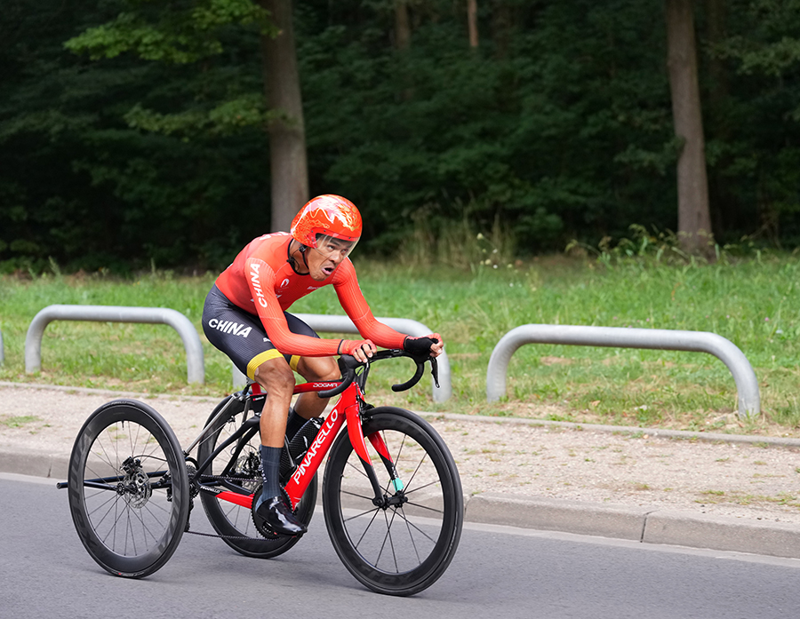 9月4日,在巴黎残奥会公路自行车男子个人计时赛T1-2级比赛中,中国选手陈健新以21分35秒78的成绩夺得冠军。