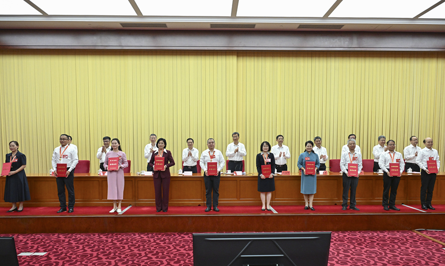 9月8日,庆祝第40个教师节暨全国教育系统先进集体和先进个人表彰活动在北京举行。这是获奖集体和个人代表领奖。新华社记者 李鑫 摄