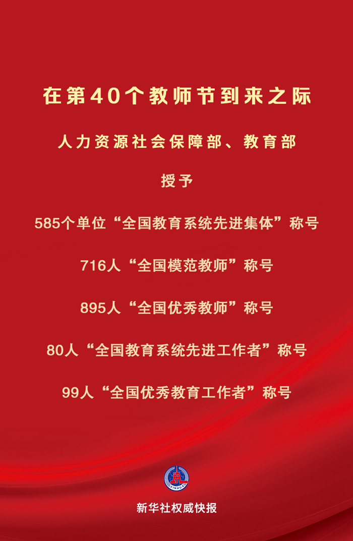 新华社北京9月8日电 题:第40个教师节:585个单位、1790人受到表彰 大国良师无上光荣