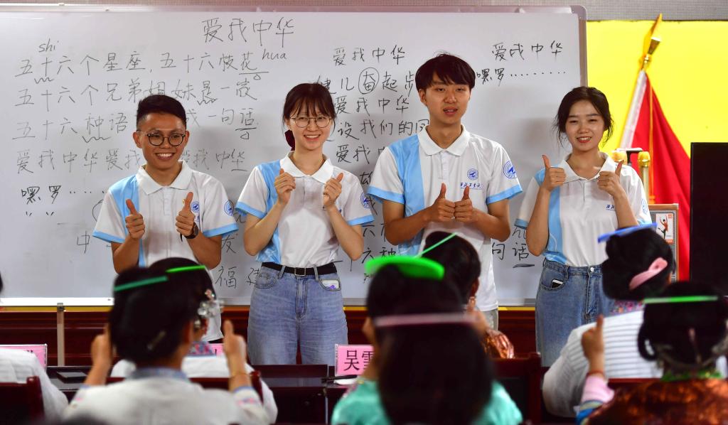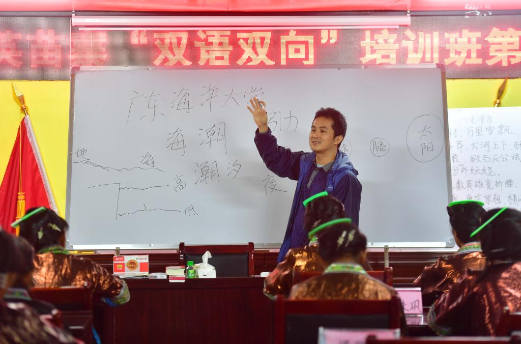 在乌英苗寨“双语双向”夜校课堂上,大学生潘木枝给同学们上课(2020年6月8日摄)。