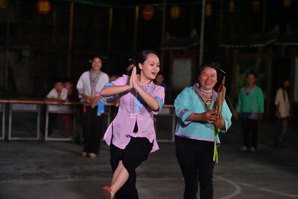 在乌英苗寨,广西“桂姐姐”讲解员叶子雯(左)在指导妇女们练习跳舞(8月8日摄)。