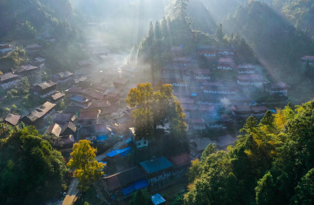 晨曦中的乌英苗寨(2021年11月18日摄,无人机照片)。