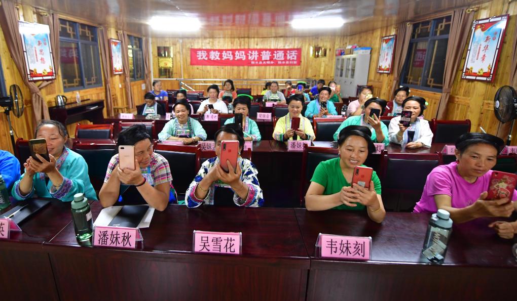 在乌英苗寨“双语双向”夜校课堂上,妇女们用手机记录黑板上的教学内容(2020年8月11日摄)。