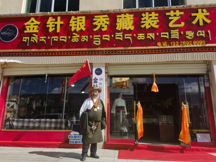 布嘎在他的“金针银秀藏装艺术”缝纫店前。新华社记者 舒静 摄