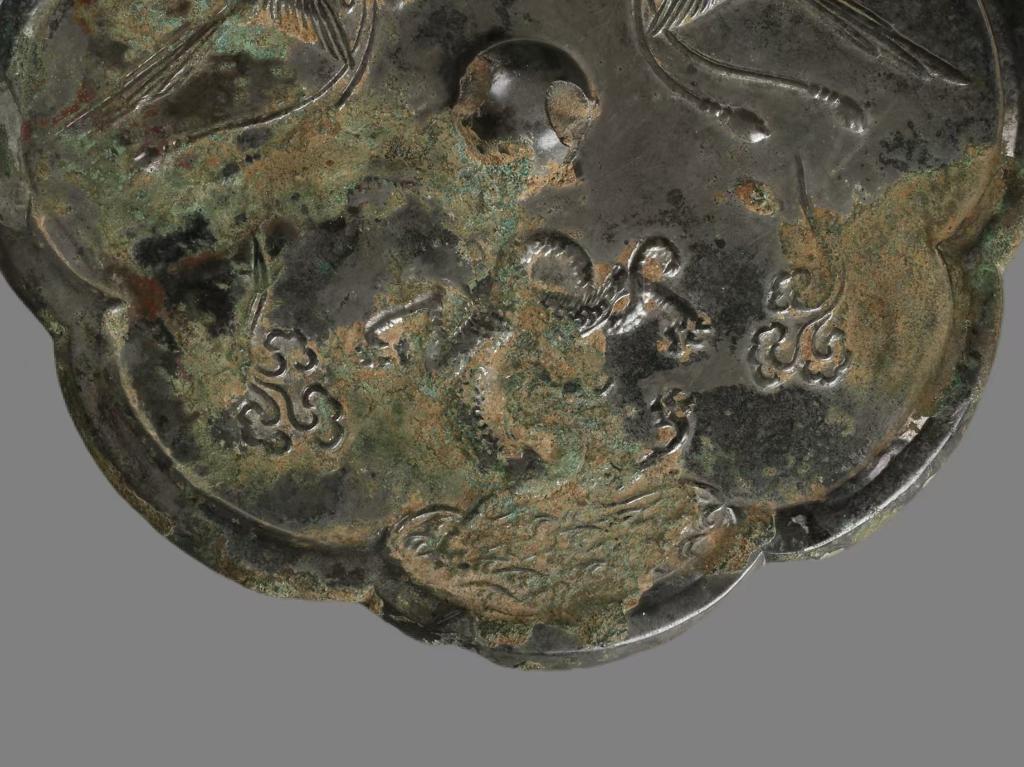 铜镜呈八瓣葵花形,在中央的镜钮四周,自下而上分三个部分构成了由水面到天空的立体空间。最下层为波光粼粼的一汪水面,虽然这一部分留存有因长期埋藏地下而产生的锈迹,但仍依稀可辨碧波之上有一条昂首翘尾的龙。它四肢张开,龙尾反折向龙首上方并缠绕于一足之上,龙身两侧各一朵祥云,衬托出神龙腾跃翻飞的身姿。