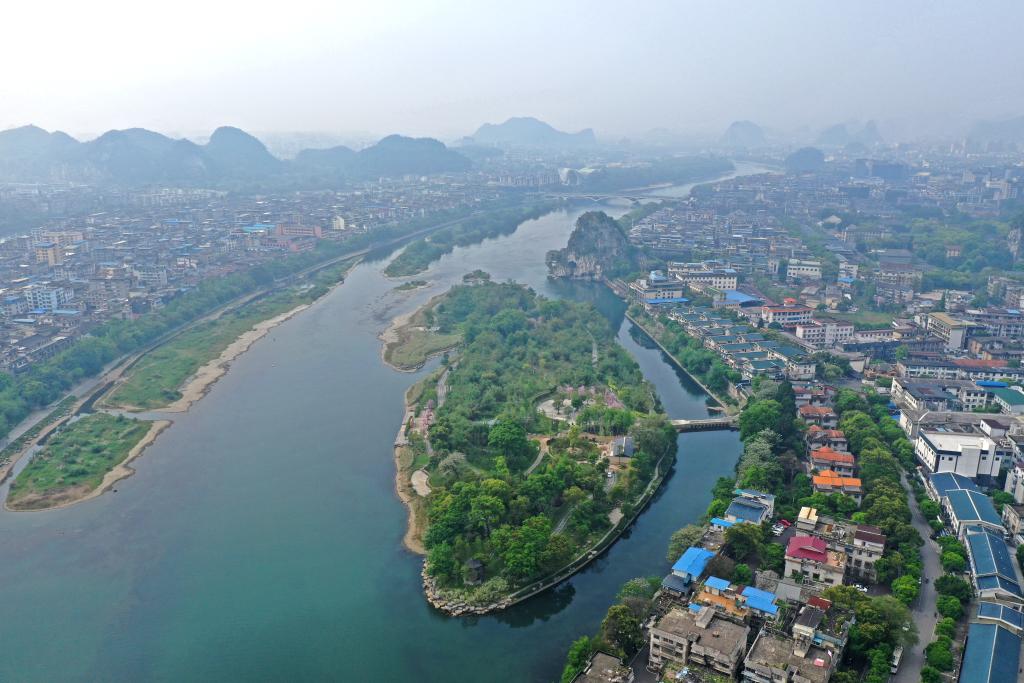生态修复改造后的漓江伏龙洲景色(无人机照片)。新华社记者 周华 摄