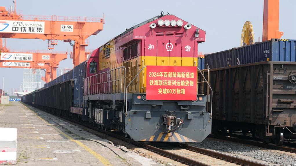 2024年9月14日,一列带有突破60万标箱标志的铁海联运班列准备从钦州铁路集装箱中心站驶出。新华社记者 张爱林 摄