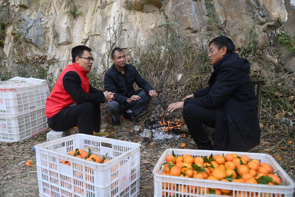2023年12月25日,在广西百色市乐业县新化镇百坭村,百色市委宣传部驻百坭村第一书记农俊海(左一)向群众了解砂糖橘行情。新华社记者 陆波岸 摄