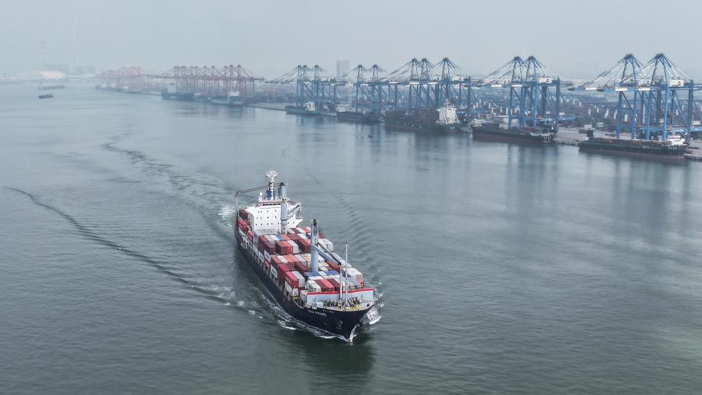 2024年9月14日,一艘满载集装箱的海轮驶离钦州港码头(无人机照片)。新华社记者 张爱林 摄