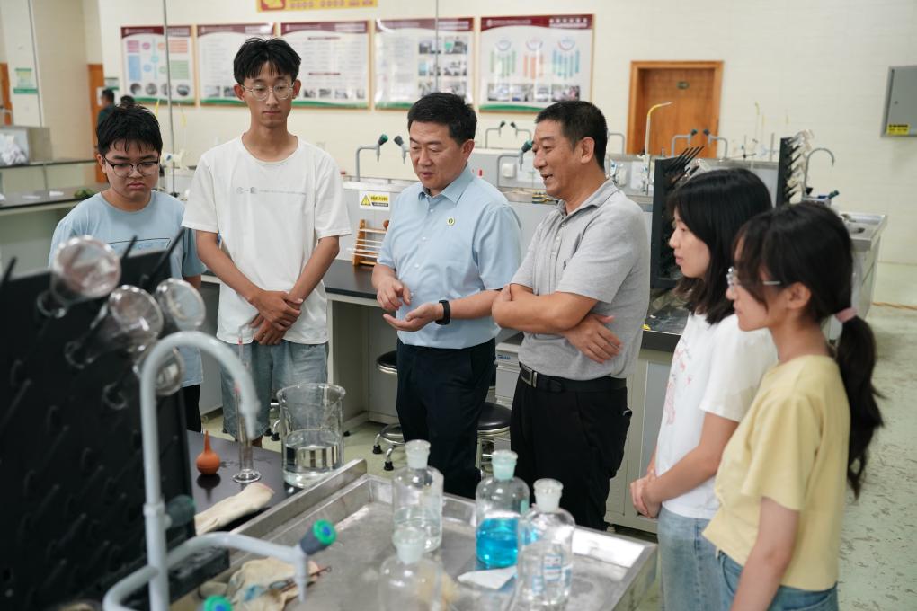 西北农林科技大学副校长房玉林(左三)、葡萄酒学院院长刘树文(左四)在学院内与学生交流。新华社记者 邵瑞 摄
