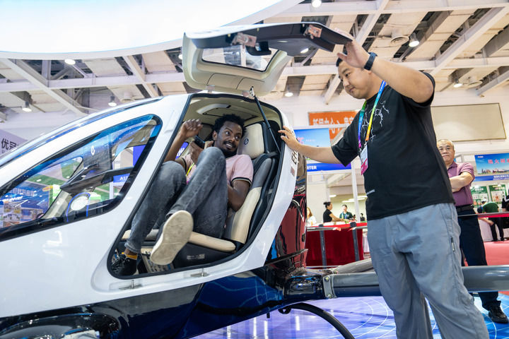 2024年5月31日,观众在第十三届中国中部投资贸易博览会体验载人无人驾驶航空器。新华社记者 陈思汗 摄