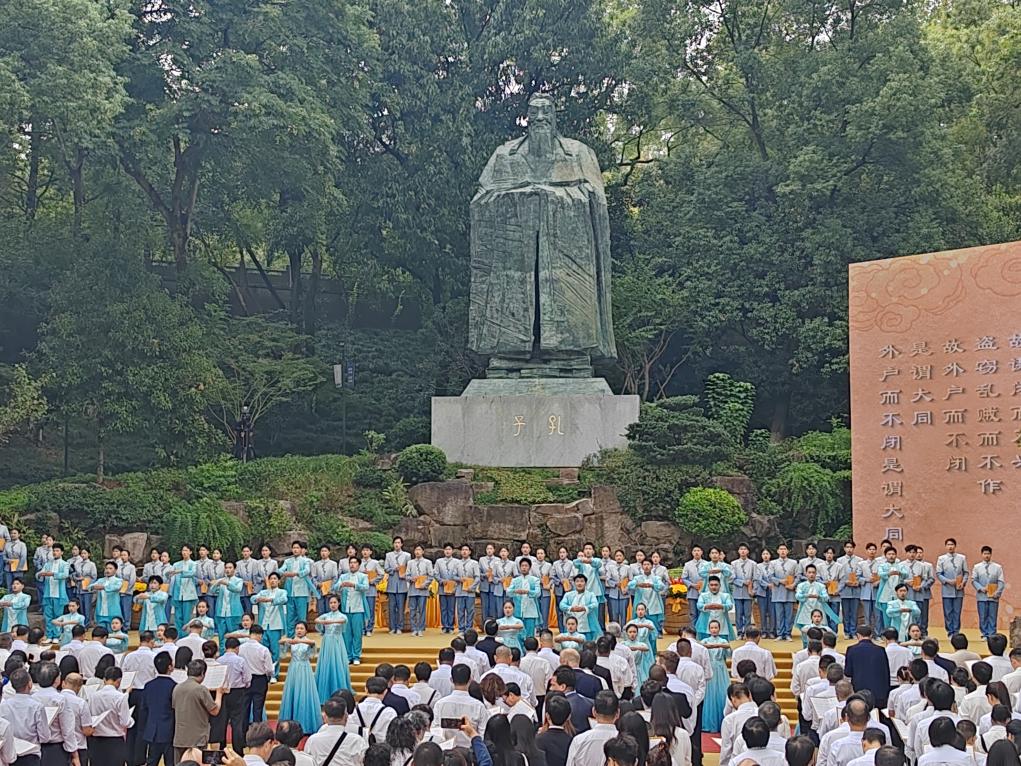 衢州南孔祭典9月28日上午举行,图为参祭人士在孔子文化广场上同唱《大同颂》。新华社记者 冯源 摄