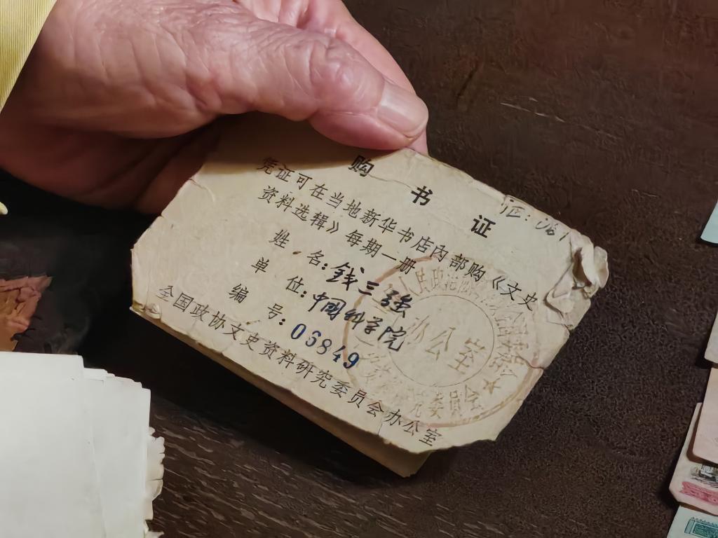钱民协向记者展示钱三强的购书证。新华社记者宋晨 摄