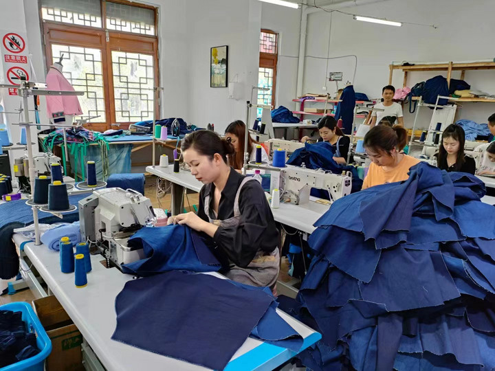 图为李利(左一)在加工车间裁剪布料。(受访者供图)