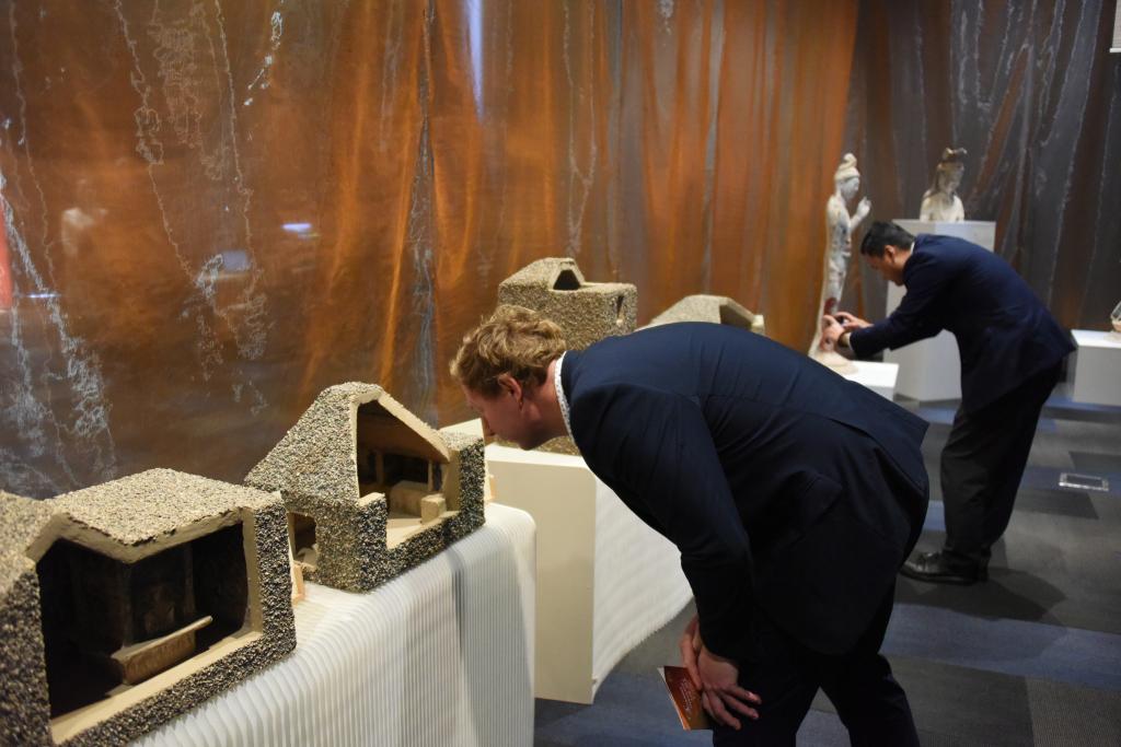 新中友协奥克兰分会副主席利奥·德·格拉夫在VR展台体验数字化还原的莫高窟第285窟后,表达了自己“要去一次敦煌”的愿望。新西兰国会议员珍妮·萨莱萨穿过莫高窟第3窟的复制洞窟,感叹“真切体会到美与文化之间的相互关联”。