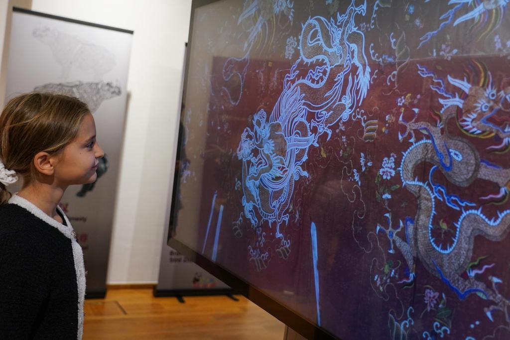 9月27日,在比利时布鲁塞尔中国文化中心,观众在“看见中国”之《纹样与色彩:中华工艺之美》数字文化展上参观。新华社记者 彭子洋 摄