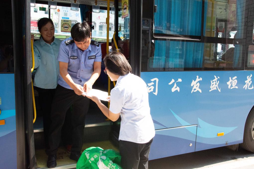 花垣县城乡客运公交车司机莫雪峰(中)将快递包裹投递到沿线村站点,与村站点负责人完成对接。新华社记者柳王敏 摄