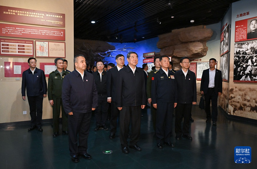 10月7日,中共中央政治局委员、国务院副总理、中央代表团团长何立峰率中央代表团来到新疆生产建设兵团八师石河子市慰问调研。这是何立峰率中央代表团来到新疆兵团军垦博物馆,听取兵团屯垦戍边的革命历史,详细了解兵团人在推动新疆发展、增进民族团结、维护社会稳定、巩固国家边防等方面作出的重要贡献。新华社记者 李响 摄