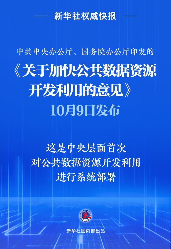 中共中央办公厅、国务院办公厅印发的《关于加快公共数据资源开发利用的意见》10月9日发布,这是中央层面首次对公共数据资源开发利用进行系统部署。